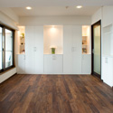 無垢を使用して、高級感のある空間にしたかったというお施主様。床には特にこだわり、たくさんのサンプル品を見て、華麗な木目を持つエレガントなブラックウォールナットに決めました。建具も床に合わせてシャープなデザインを選択。リビングの壁一面には、シンメトリーに造作したオリジナルの家具で収納だけでなく、飾り棚としても使えるよう設計しました。大好きなホームシアターを楽しめるくつろげる空間に仕上がったとご満足いただきました。